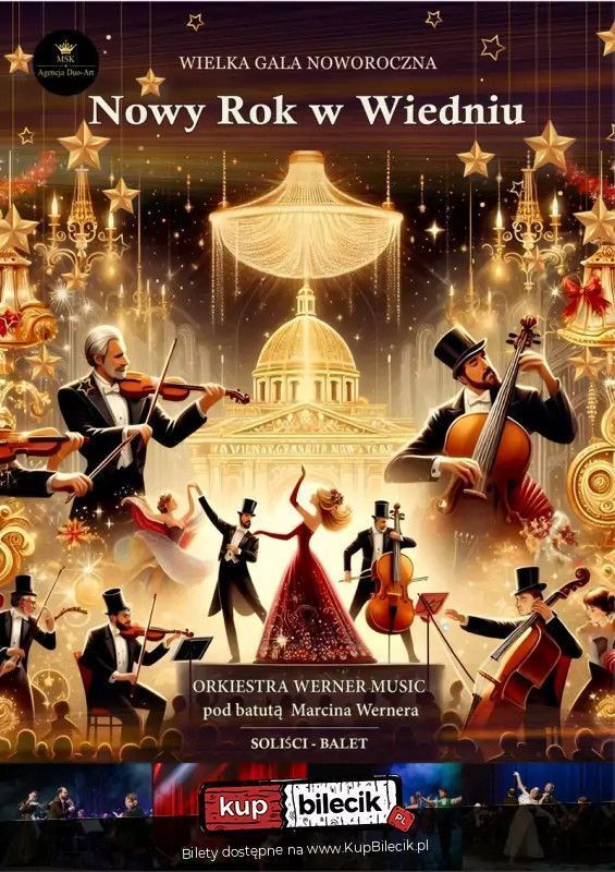 Wielka Gala Noworoczna 2026 - "Nowy Rok w Wiedniu". Już teraz pragniemy zaprosić Państwa w magiczną, karnawałową podróż do roztańczonego Wiednia! Podczas tego dwuczęściowego koncertu zaprezentowane zostaną dystyngowane walce, gorące czardasze, najpiękniejsze arie i duety operetkowe oraz wielkie przeboje świata estrady a wszystko to w wykonaniu wybitnych solistów, tancerzy oraz orkiestry. Nasz koncert to połączenie klasycznej wiedeńskiej formy z współczesnymi przebojami, co stanowi gwarancję wspaniałej zabawy i szampańskiego nastroju! Nie może Państwa zabraknąć! Przywitajmy wspólnie Nowy 2026 Rok!