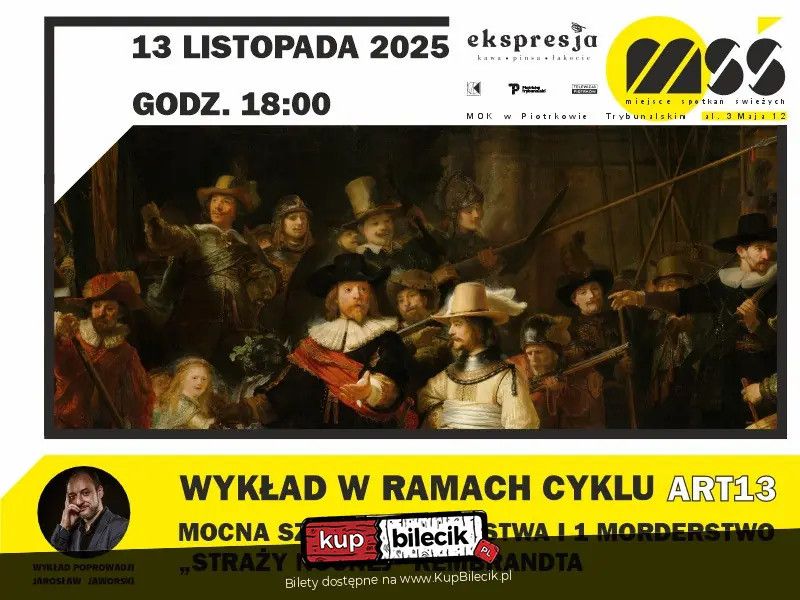 bilety: ART13: 3 Kłamstwa i 1 Morderstwo - "Straż Nocna" Rembrandta! Zapraszamy na drugi, trzymający w napięciu wykład w ramach naszego cyklu ART13: Mocna Sztuka! ART 13: "Straż Nocna" Rembrandta artyści: Jarosław JaworskiPrawda Ukryta za Wymarszem Obraz, namalowany w 1642 roku, tylko pozornie przedstawia zwykłą scenę wymarszu oddziału strzelców z zacienionej bramy. W rzeczywistości to mistyfikacja, która od ponad 380 lat ukrywa mroczną prawdę! Podczas spotkania dowiemy się, że "Straż Nocna" kryje wiele zagadek, w tym... jedno morderstwo! Wystarczy zacząć szukać, by zrozumieć, że to, co widzimy na płótnie, jest celowo skonstruowaną intrygą, pełną trzech kłamstw i jednej zbrodni. Przyjdźcie i przekonajcie się, dlaczego Rembrandt, mistrz światłocienia, postanowił stworzyć obraz, który miał być portretem zbiorowym, a stał się wizualnym śledztwem! Bilety do nabycia na: KupBilecik.pl |